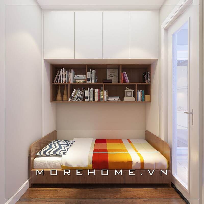 Không gian nghỉ ngơi của phòng ngủ nhỏ với nội thất gỗ công nghiệp sẽ đem lại một không gian nhẹ nhàng, thanh lịch. Chiếc giường ngủ bọc nỉ xanh ngọc sẽ làm nên một ấn tượng đặc biệt trong căn phòng, trở thành điểm nhấn nổi bật.